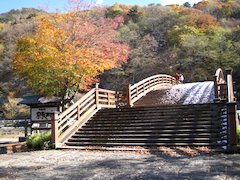 中山道と国道19号線に挟まれた奈良井川にかかる、総檜造りの太鼓橋、周りの紅葉が綺麗だった。この橋街道筋から離れた所に掛かっているが、こんな立派な橋当時はあったのでしょうか、それともと宿場町とは関係ないが観光の目玉として造ったのか |