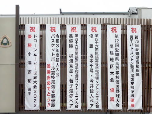 校舎には、部活の成果とともに、ドローン優勝の垂れ幕も、 例え学校にとってはプラスになるとはいえ、学校行事には無関係で、また違った 競技を認めて、祝幕を掲げる高校側の取り計らいも嬉しい。