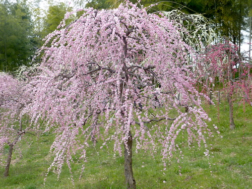 しだれ梅は八重咲きで、たれ下がった枝にたくさんの花を咲かせる様は、